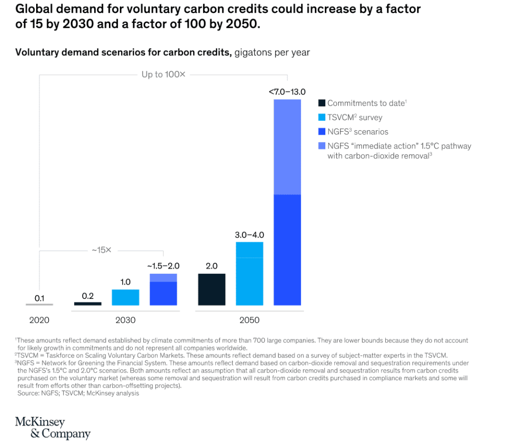 Currently, companies committing to net-zero emissions by 2050 and other ambitious climate targets represent a significant portion of the global market, amounting to over $20 trillion in market capitalization. More than 30% of Fortune 500 companies have pledged climate actions before 2030. These companies rely on carbon offsets traded in the voluntary carbon credit market to achieve their sustainability goals, highlighting the market’s essential role in driving climate action and sustainability initiatives worldwide. The value of the carbon credit market is forecasted to rise upward of $50 billion in 2030.